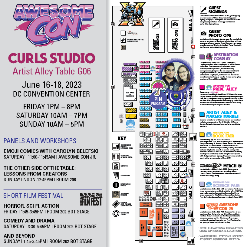 The tenth edition of Awesome Con is June 16-18, 2023 at the DC Convention Center — it is with great pride that Curls Studio has exhibited at every Awesome Con since 2013! This year Curls Studio will be located at Table G06 in Artist Alley all three days. View the map above where the purple pulse signal circles are so you’ll know where to find us.
