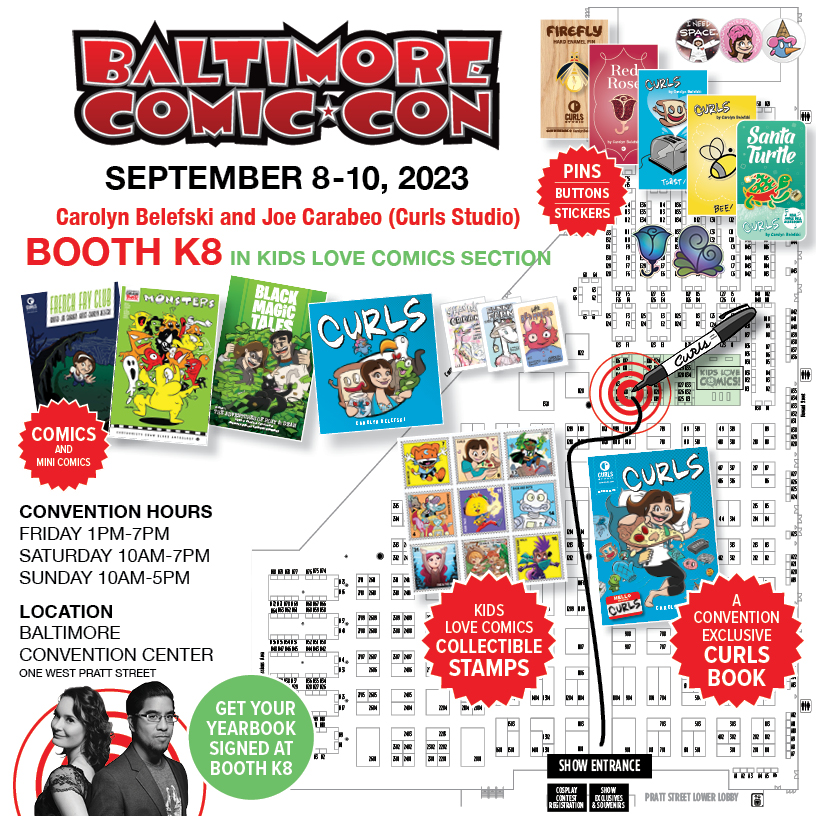 Visit Curls Studio at Baltimore Comic-Con in the Kids Love Comics section at Table K8. Click on the map image above to see a large map of where to find us. Kids 10 and under get in free with paid adult admission.