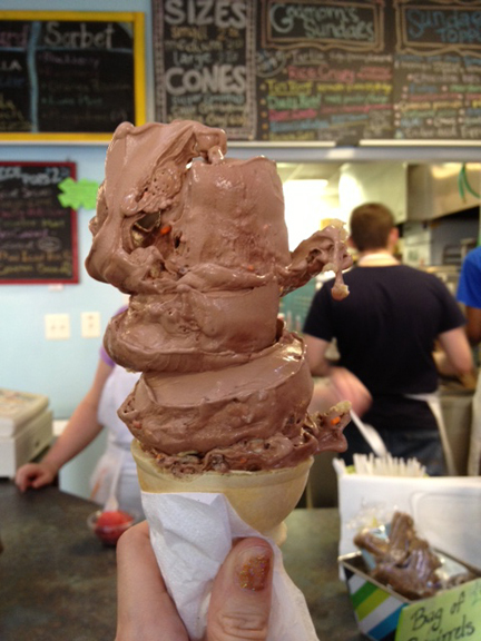 On Friday evening I met my friend, Hannah, at The Dairy Godmother in Alexandria, VA. I had not been there in handful of years and it was good to see such a place still going strong. It seems like more and more independent shops in the area are decreasing. Please visit this lovely custard and sorbet venue! We went because the special was “Cicada Crunch.” Needless to say, I was upset they didn’t use real cicadas, but I don’t have the guts to capture my own and eat them… would like to try… maybe if someone else prepared the meal for me…