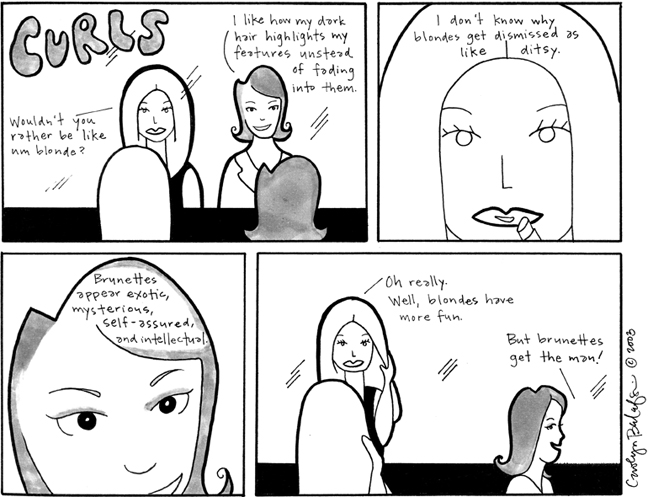 The character Curls is talking to doesn’t look like Kathryn, but she appeared in a couple strips published in VCU’s The Commonwealth Times in 2003 (posted above). I have wanted to try and use this character again and have not found the proper opportunity until now. I also think it’s kinda funny that they have not seen each other in eight years. Do you think my art has improved?