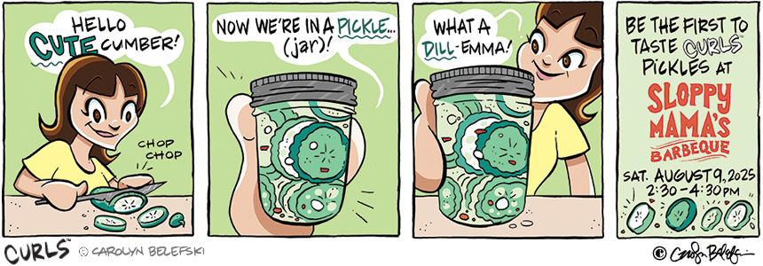 Would you believe it? I won Best Pickle in the first annual Sloppy Mama’s BBQ homemade pickle contest at their Pickle Party. I entered two types of pickles inspired by my Curls comic strip: dill and watermelon rind, and the dill was dill-licious enough to win first place. It was so great — they even had pickle ice cream! They asked me to be a contestant next year to defend my title, so look for more pickle news in 2026!