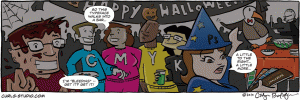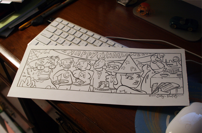 Well, I did some thinking about it and decided to do a full-on comic strip instead of a sketch. The nerdiest thing I could think of was having Curls throw a Designer’s Halloween Party. As you can see, she is a Photoshop Wizard bossing, oh, I mean “art directing” Pitter Patter the penguin as he adjusts the banner to her liking. Some of the guests came as CMYK and a “bleeding” man. Maybe that’s Steve Jobs in the background? Yeah, think it would be pretty dorky to dress up in honor of design for Halloween, but designers are dorky anyway, so it’s all good.
