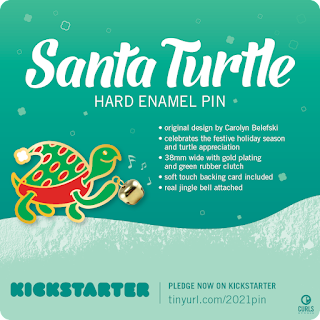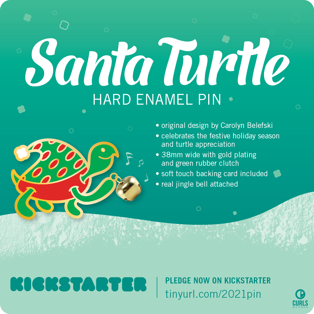The campaign will end on November 4, 2021 so I can have time to produce, package, and ship out the pins in a timely manner for the holiday season. Santa Turtle is a jolly turtle who lives in the North Pole with Santa Claus providing encouragement to the working elves by ringing a bell to cheer the Christmas crew. The character first appeared in my comic strip, Curls.
