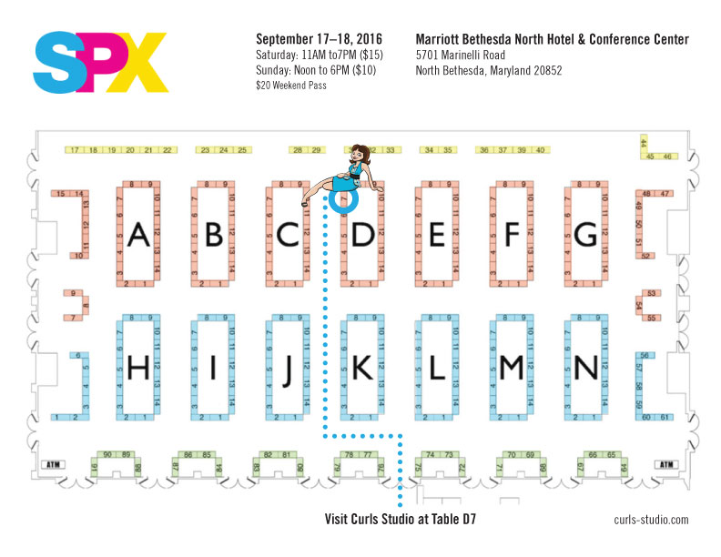 I hope to see you as we celebrate the preeminent showcase for the exhibition of independent comic books and the discovery of new creative talent at SPX. Please click the map above to locate Curls Studio sharing Table D7 with Marguerite Dabaie.