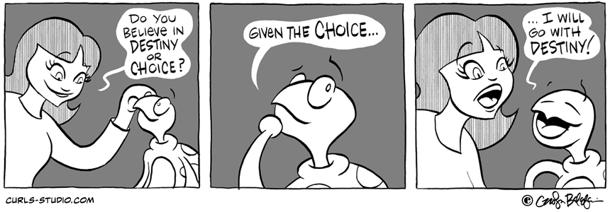 So, which do you believe in: Destiny or Choice? It seems like Turtle Neck and Curls believe in both! I used a different technique for the word balloons in this strip. Let me know what you think of this method.[…]↓ Read the rest of this entry…